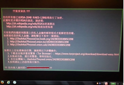 近期流行的Locky病毒是通过邮件传播的一种典型勒索软件。Locky能够通过社会工程学手段试图诱骗用户打开电子邮件的Microsoft Office附件。一旦运行doc文件,嵌入的宏会下载病毒体并感染主机,其使用RSA-2048和AES-1024加密算法来加密大量用户文件,然后要求受害者支付赎金,以恢复自己的文件,如下图所示。