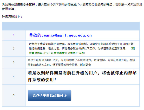 4)警惕各类通过电子邮件索要用户名和密码的情况,网络中心和校内相关管理部门都不会通过电子邮件索要邮件系统用户名和密码的,因为电子邮件存在直接投递、仿冒等协议隐患,电子邮件环境的安全水平本身就不高。