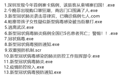 最重要的是不要下载或打开文件名中带有:“新冠肺炎疫情”、“新型冠状病毒”等相关名称,但文件扩展名又为*.exe后缀,或相关名称的zip、rar等压缩包中为*.exe后缀的可执行文件。