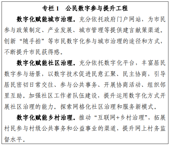 13.提升领导干部和公务员数字治理能力。加大领导干部和公务员信息化培训力度,丰富数字经济、数字社会、数字政府等领域线上培训资源,把提高党员领导干部数字治理能力作为各级党校(行政学院)的重要教学培训内容。引导领导干部和公务员运用网络了解民意、开展工作,提升学网、懂网、用网的能力。在公务员选拔任用中,加强数字能力方面的考察。