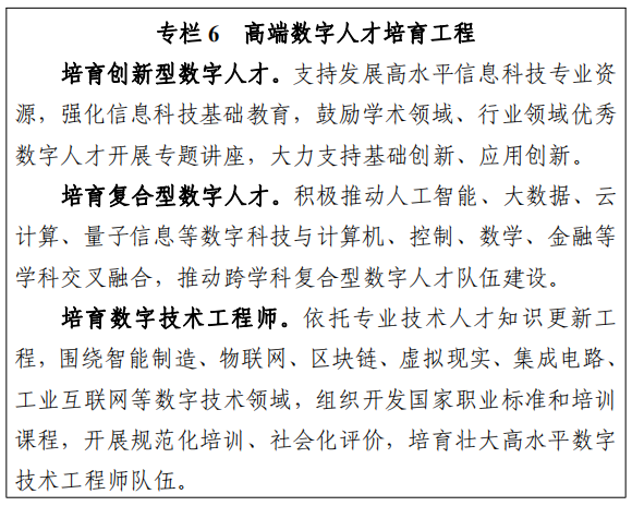 11.提升新兴职业群体数字技能。面向“互联网+教育”、互联网医疗、电子商务、供应链管理服务、线上办公、“虚拟”产业园、“无人经济”等新业态新模式,制定数字领域新职业的职业标准,丰富职业培训课程,开展从业人员培训,壮大新兴职业群体人才队伍。引导支持新兴职业群体,积极利用5G、人工智能、虚拟现实、大数据、区块链等数字技术创新创业。