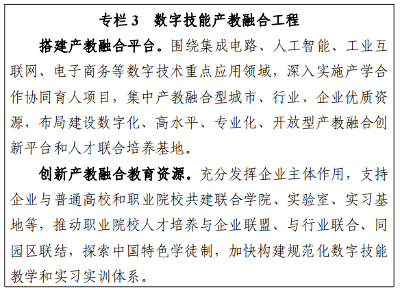 15.完善数字技能职业教育培训体系。完善数字技能职业教育,加强职业院校数字技能类人才培养,动态更新职业教育专业目录,推进专业升级和数字化改造,优化完善课程设置,建设高水平数字技能职业教育教师队伍。制定完善数字技能职业教育国家标准,推行“学历证书+职业技能等级证书”制度,打造一批高水平数字技能职业院校和专业。加大数字技能职业培训力度,研制培训方案和内容标准,规范数字技能职业培训,试点探索“互联网+”职业技能培训模式,推动数字化培训模式发展。
