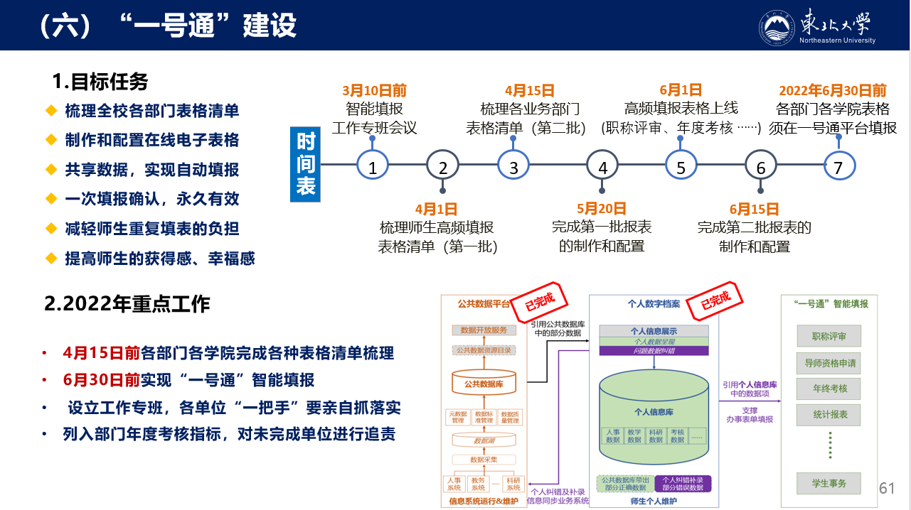智能填报工作事关师生切身利益,事关学校治理水平,学校高度重视此项工作,并将此项工作完成情况列入部门年度考核指标,对未完成部门将追责问责,各部门对本单位“一号通“智能填报工作负主体责任,信网办负责表格制作上线和数据共享的技术支持。各部门务必高度重视,“一把手”要亲自挂帅,亲自研究,亲自推动,确保表格梳理准确,智能填报早日实现,师生填表负担全面减轻。