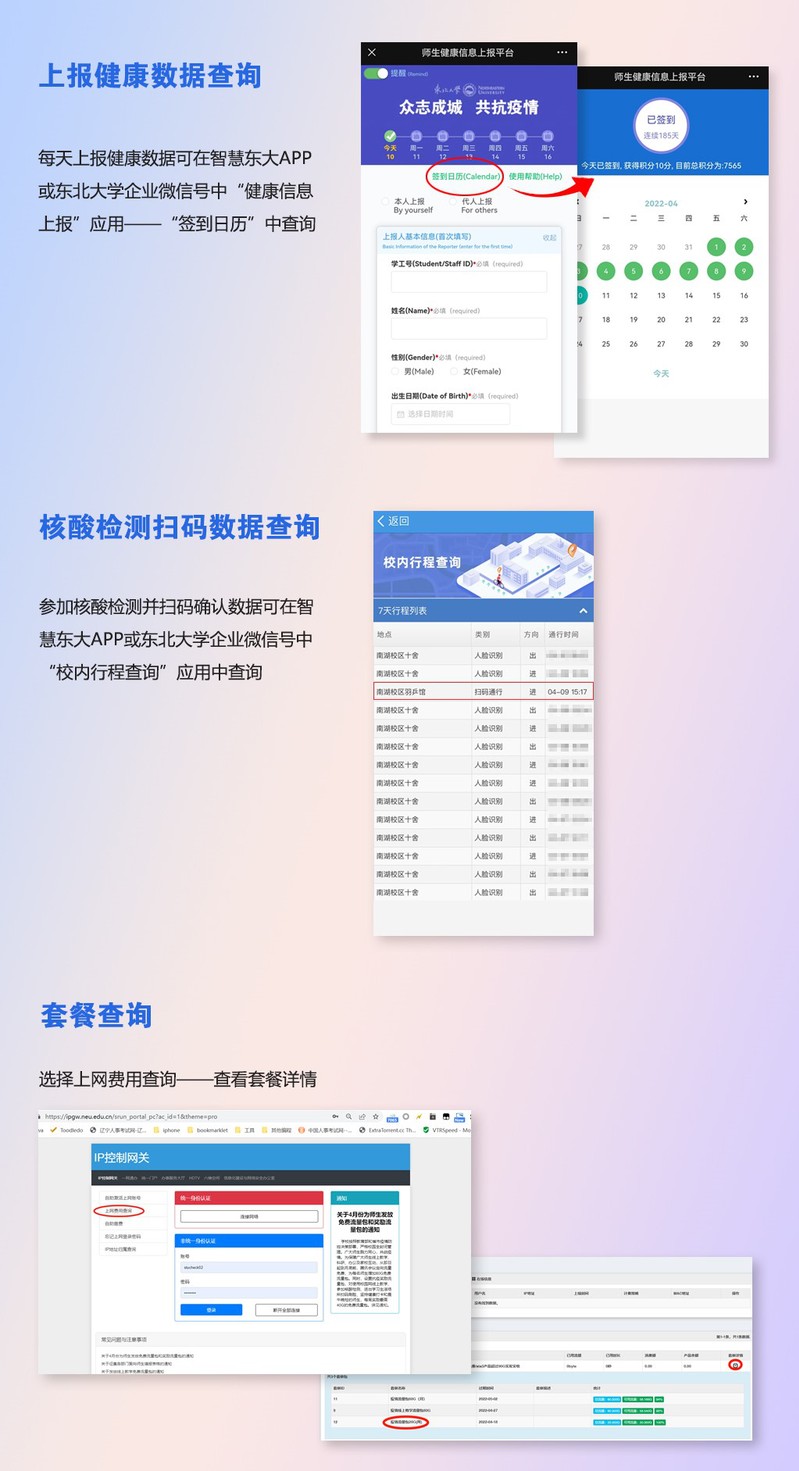 师生健康上报数据查询、核酸检测扫码数据查询以及奖励流量包到账结果查询办法如下图所示。