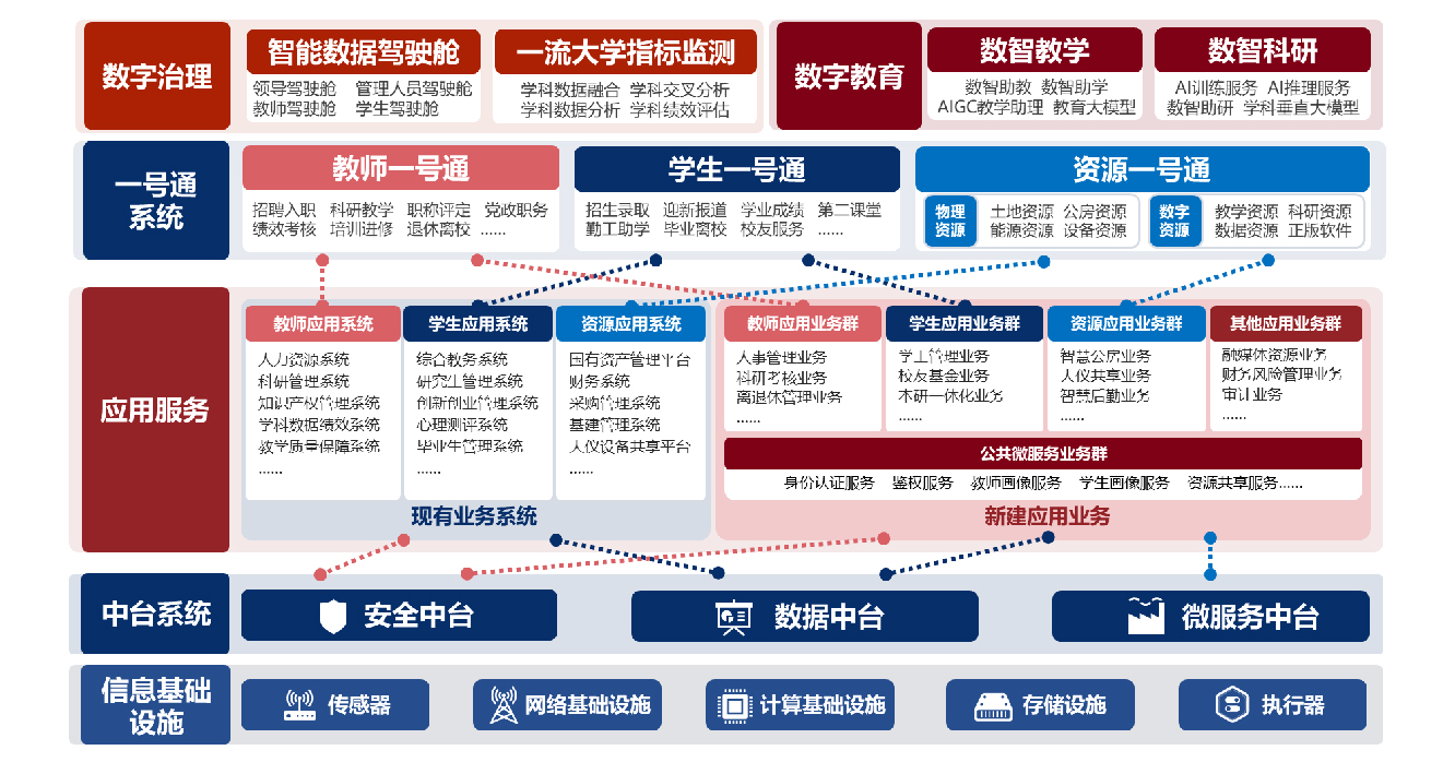 在技术体系建设方面,信网办将以智能信息基础设施建设为保障,着力打造微服务中台、数据中台和安全中台;构建基于统一中台的教师一号通、学生一号通和资源一号通应用业务系统;通过统一门户平台和智能数据驾驶舱,为全校师生提供 “业务办理、事务处理、数据汇聚、智能生成”一站式服务,实现学校公用房、大型仪器设备等物理资源和数字资源的便捷共享共治及使用绩效评价,全面赋能数字治理和数字教育。