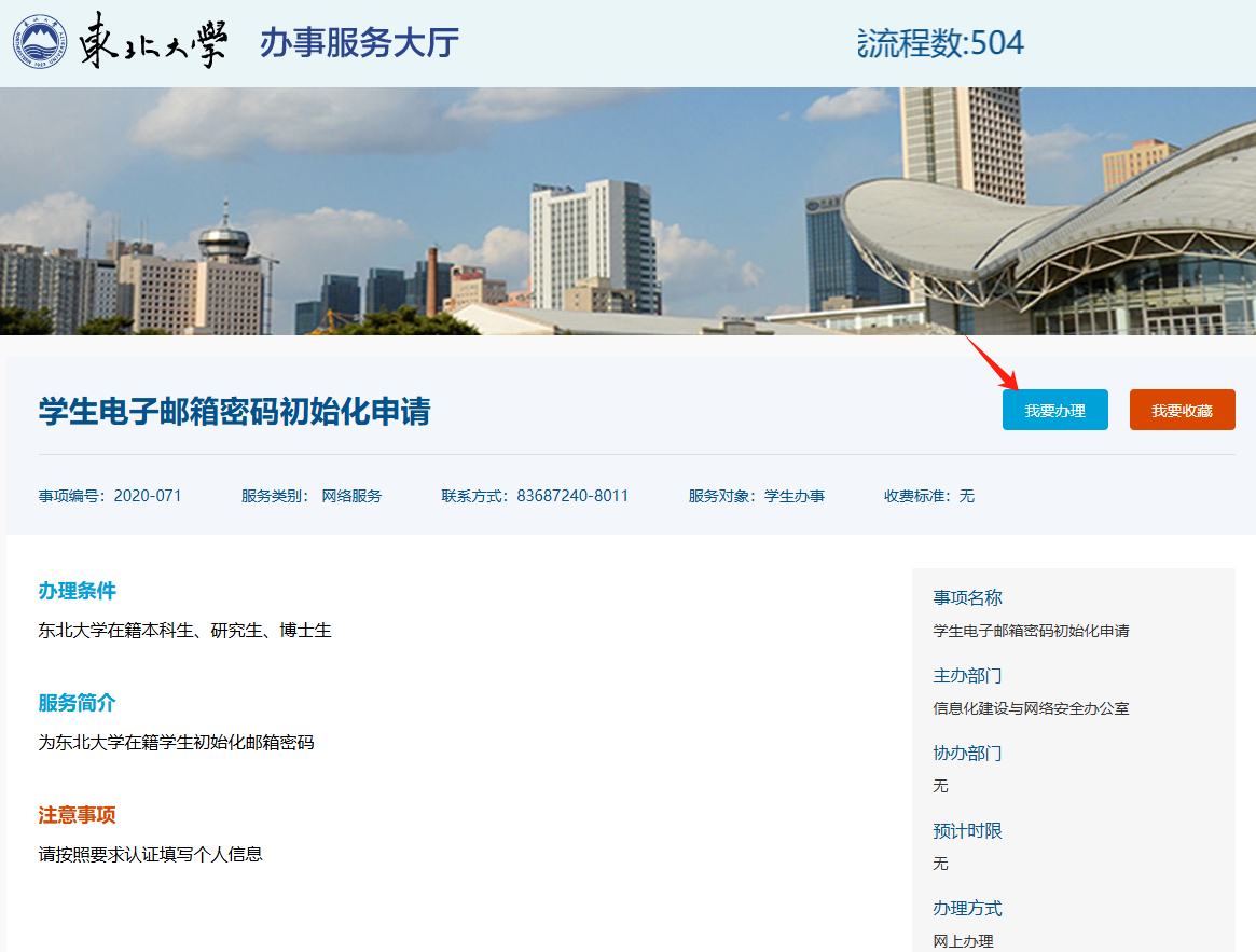 2.提交“学生电子邮箱密码初始化申请”,点击“我要办理”即可完成邮箱密码初始化。
