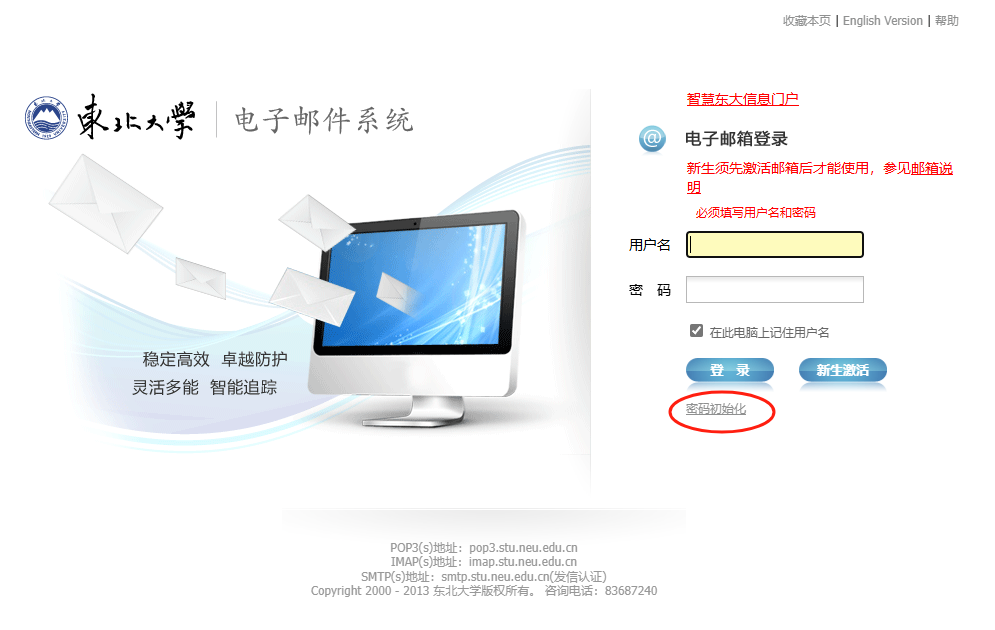 1.访问域名https://mails.neu.edu.cn/,打开东北大学学生电子邮件服务首页,点击“密码初始化”。