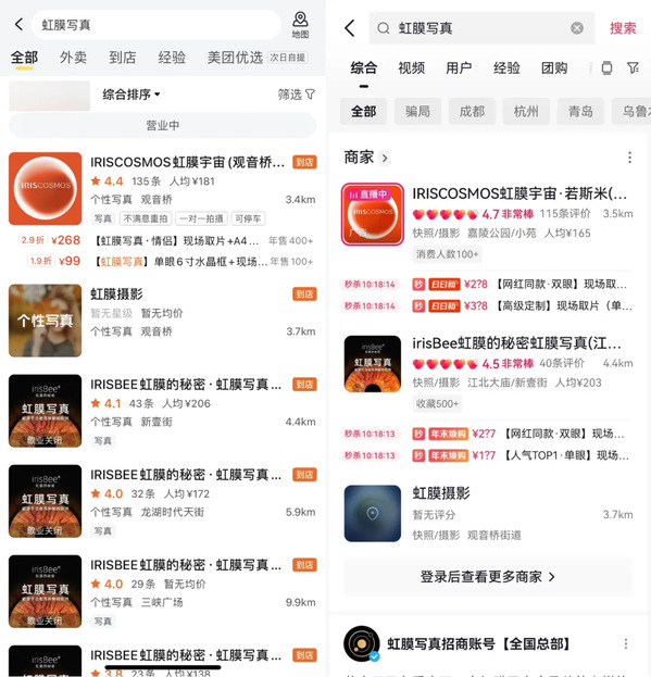 以小编所在的重庆来说,在多个App上搜索“虹膜写真”,搜索结果显示本地已有虹膜写真艺术馆。