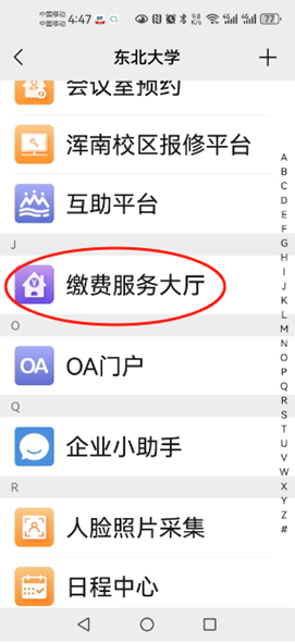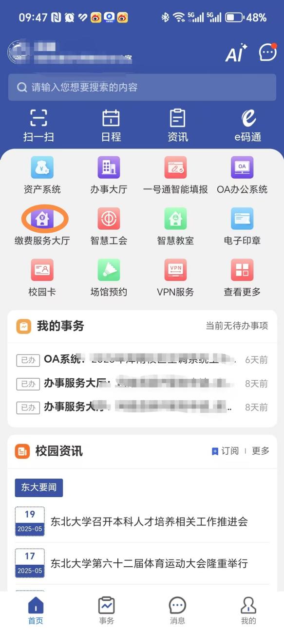 1.进入“智慧东大”APP,点击“缴费服务大厅”
